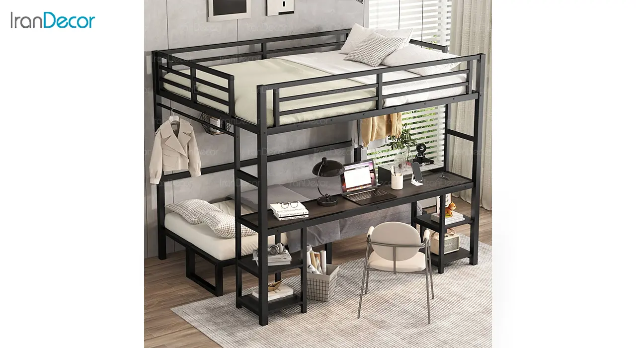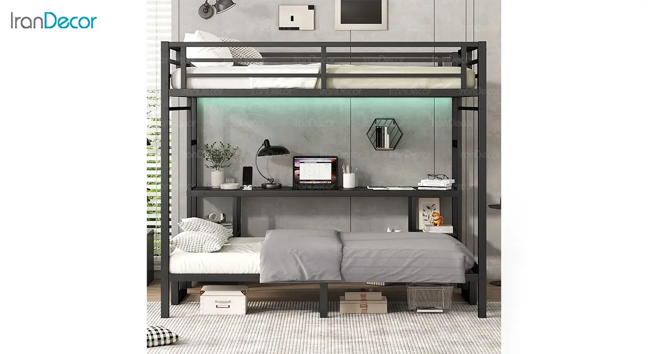 تخت خواب دو طبقه فلزی دورمی مدل لامیا همراه میز تحریر و شلف
